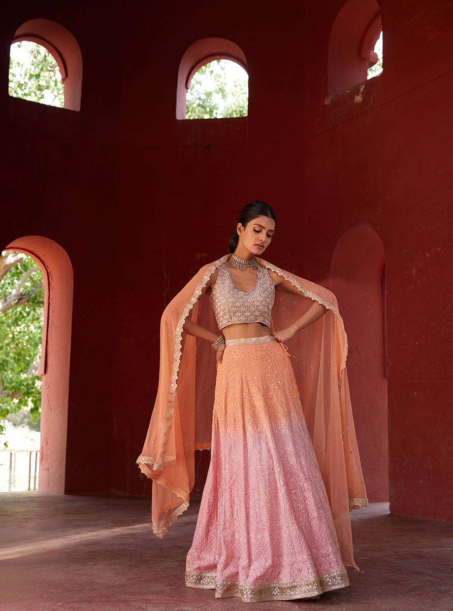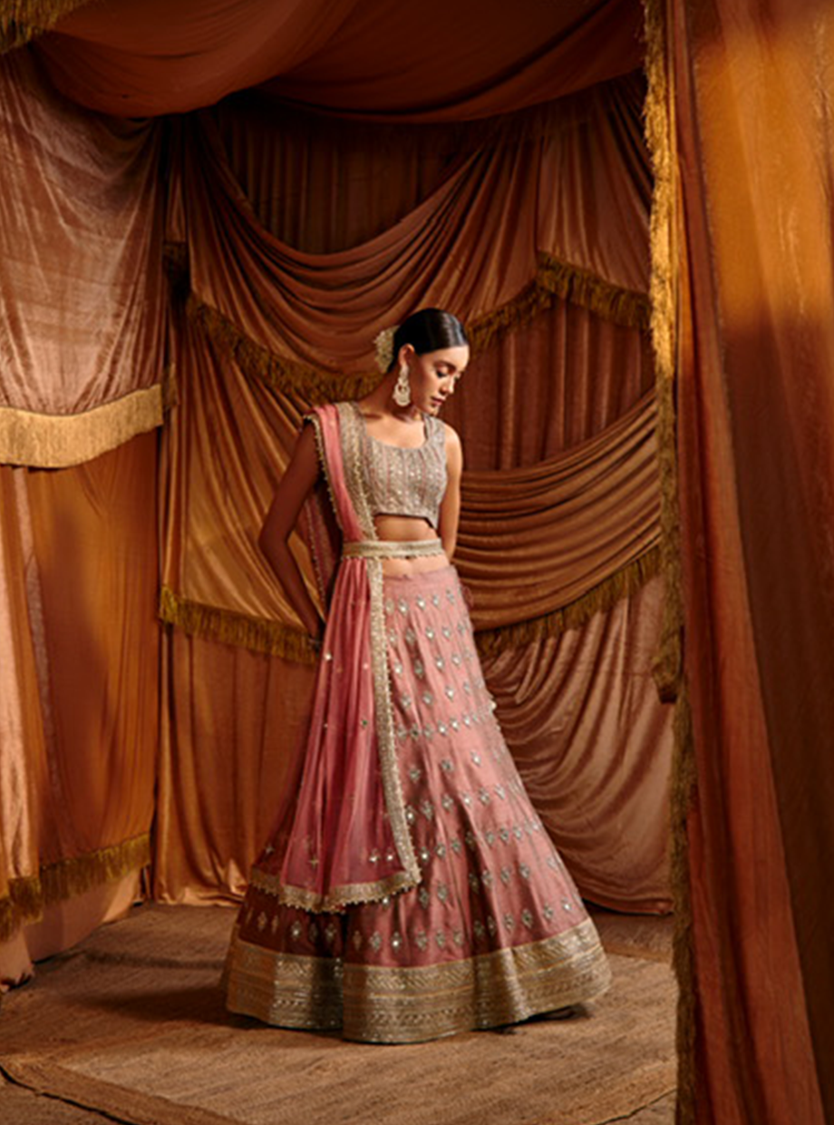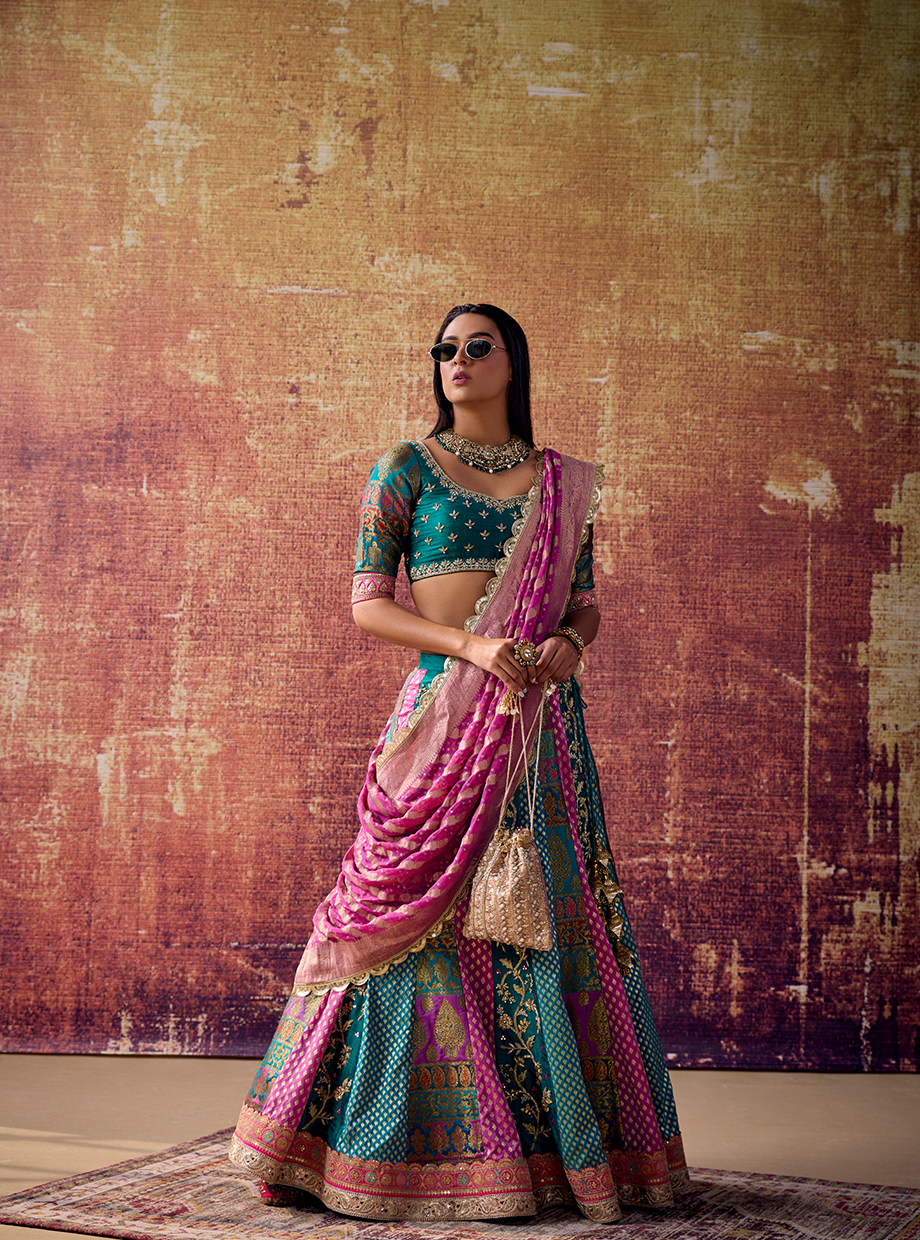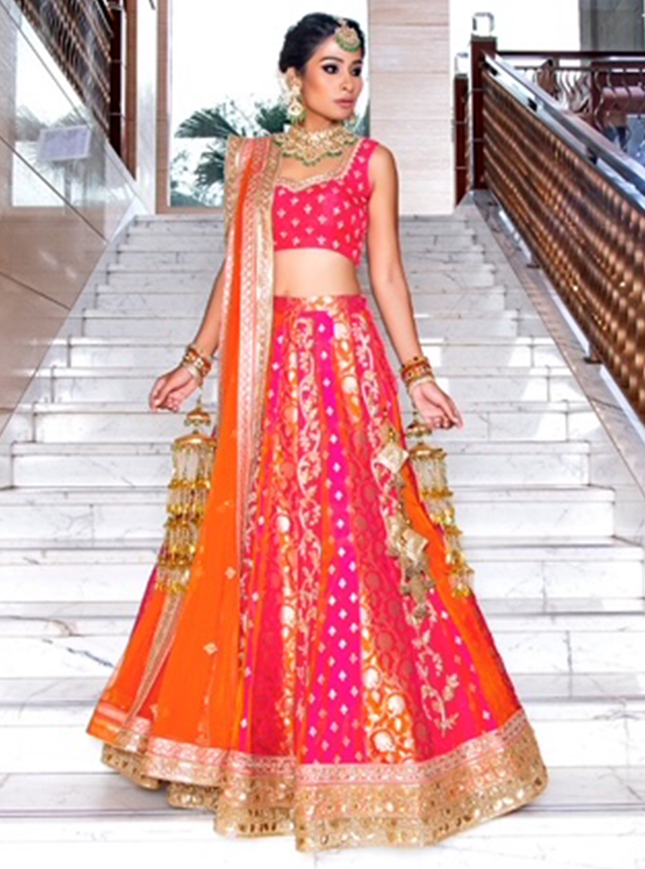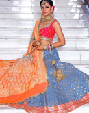 Coral And Grey Banarasi Lehenga With Gharchola Dupatta