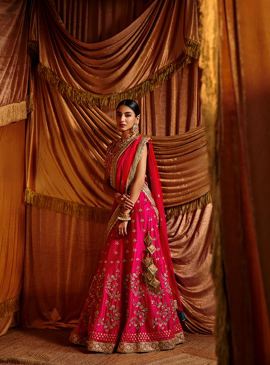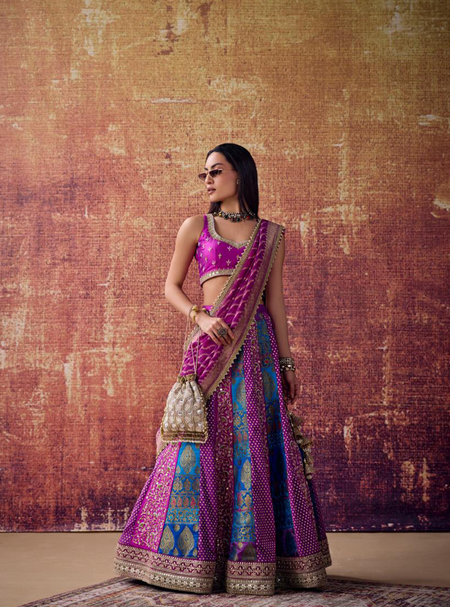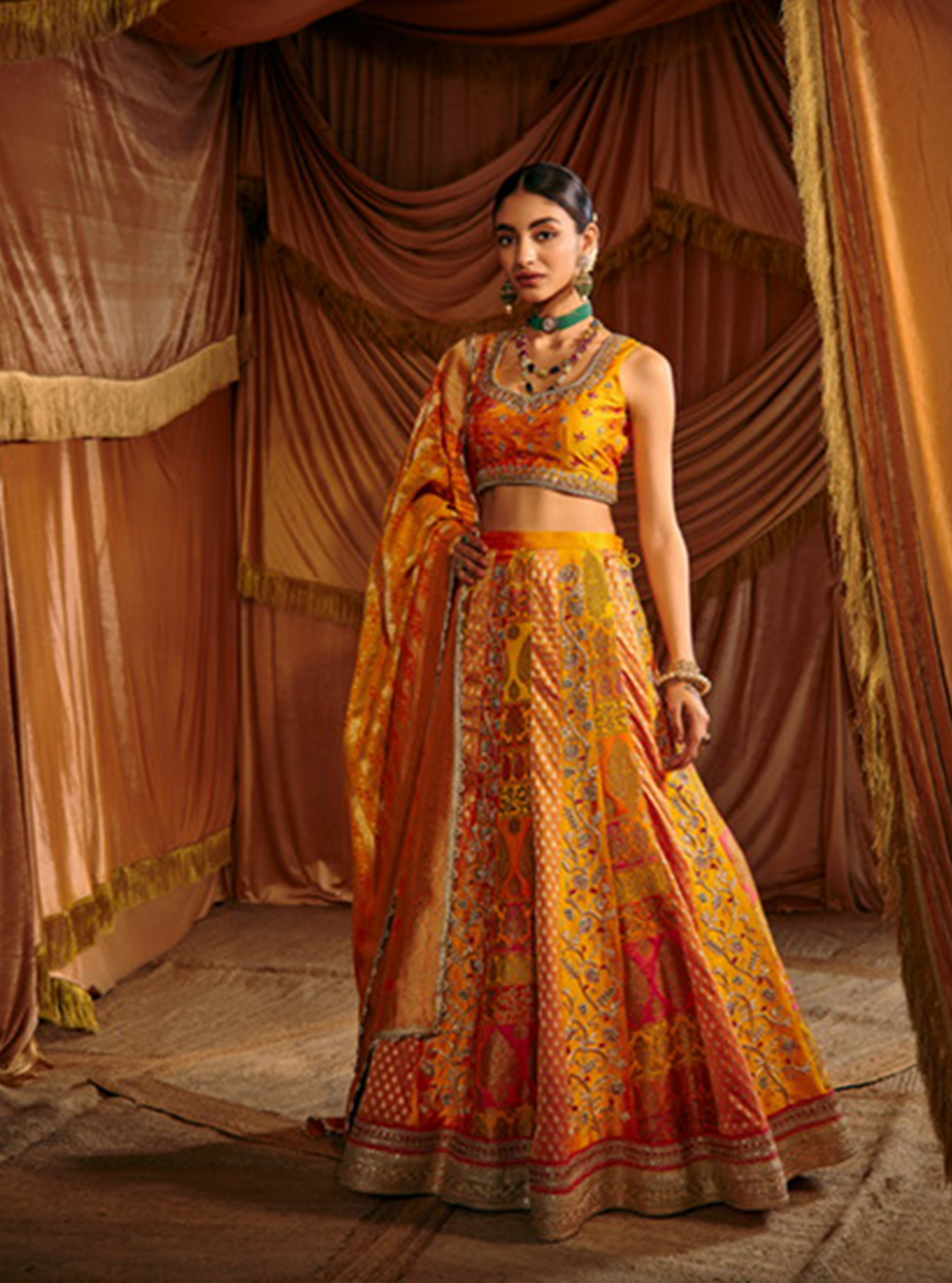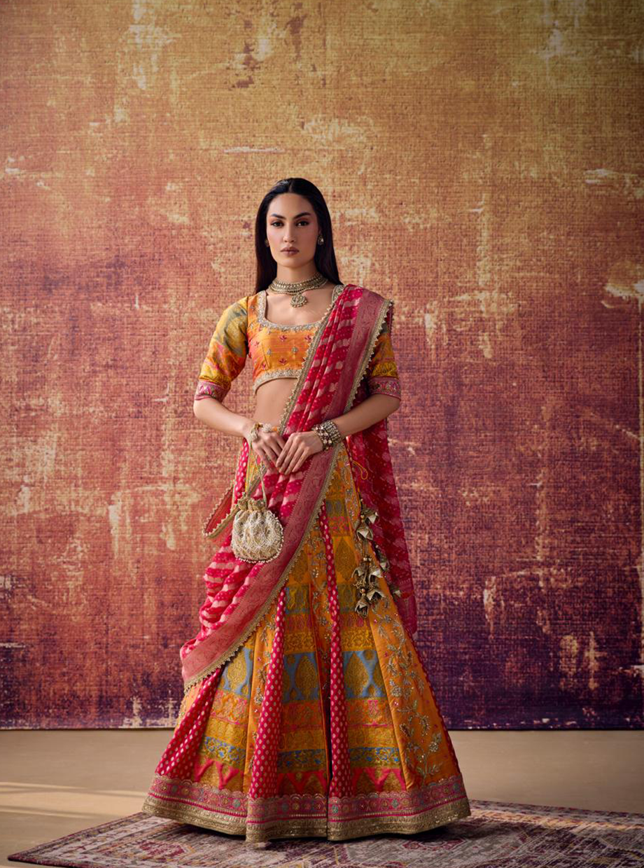 Coral And Grey Banarasi Lehenga With Gharchola Dupatta