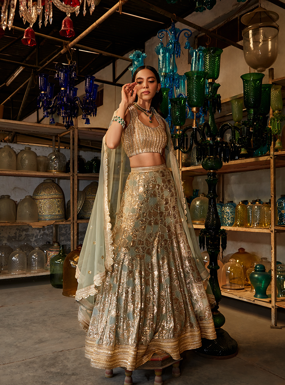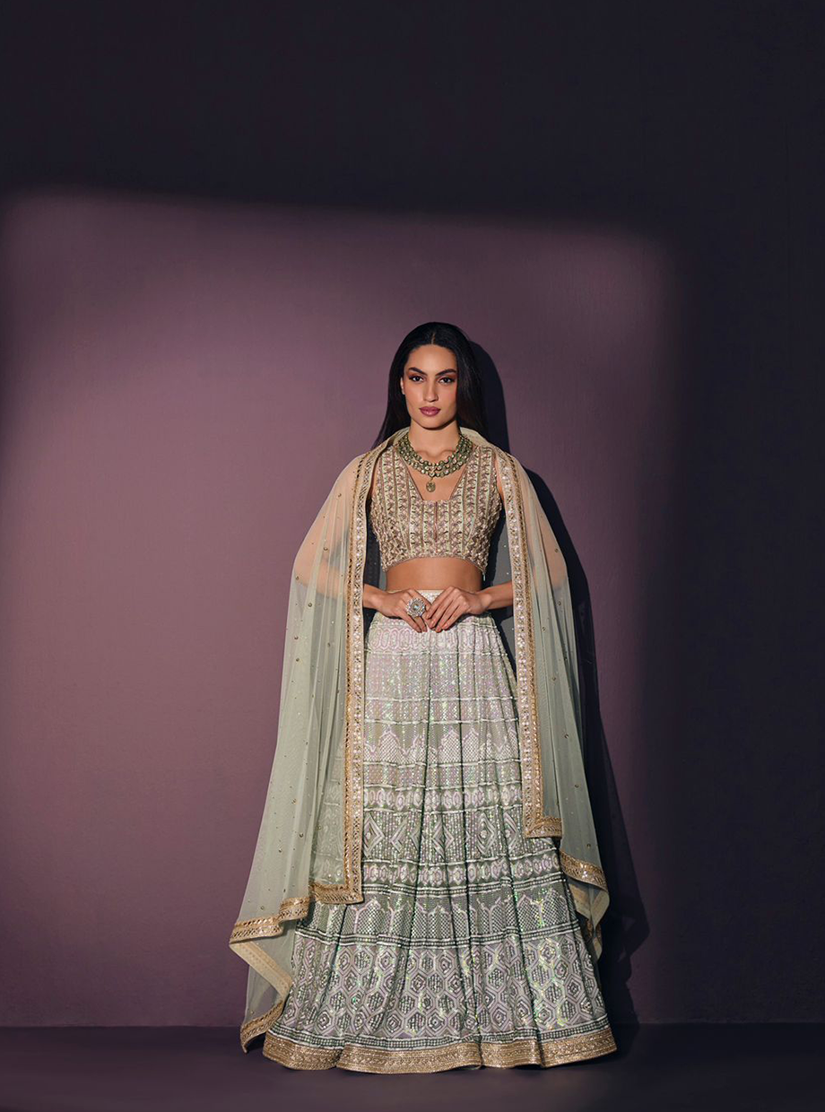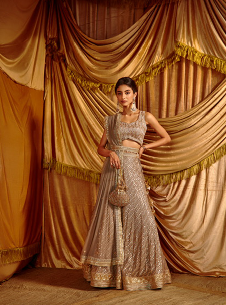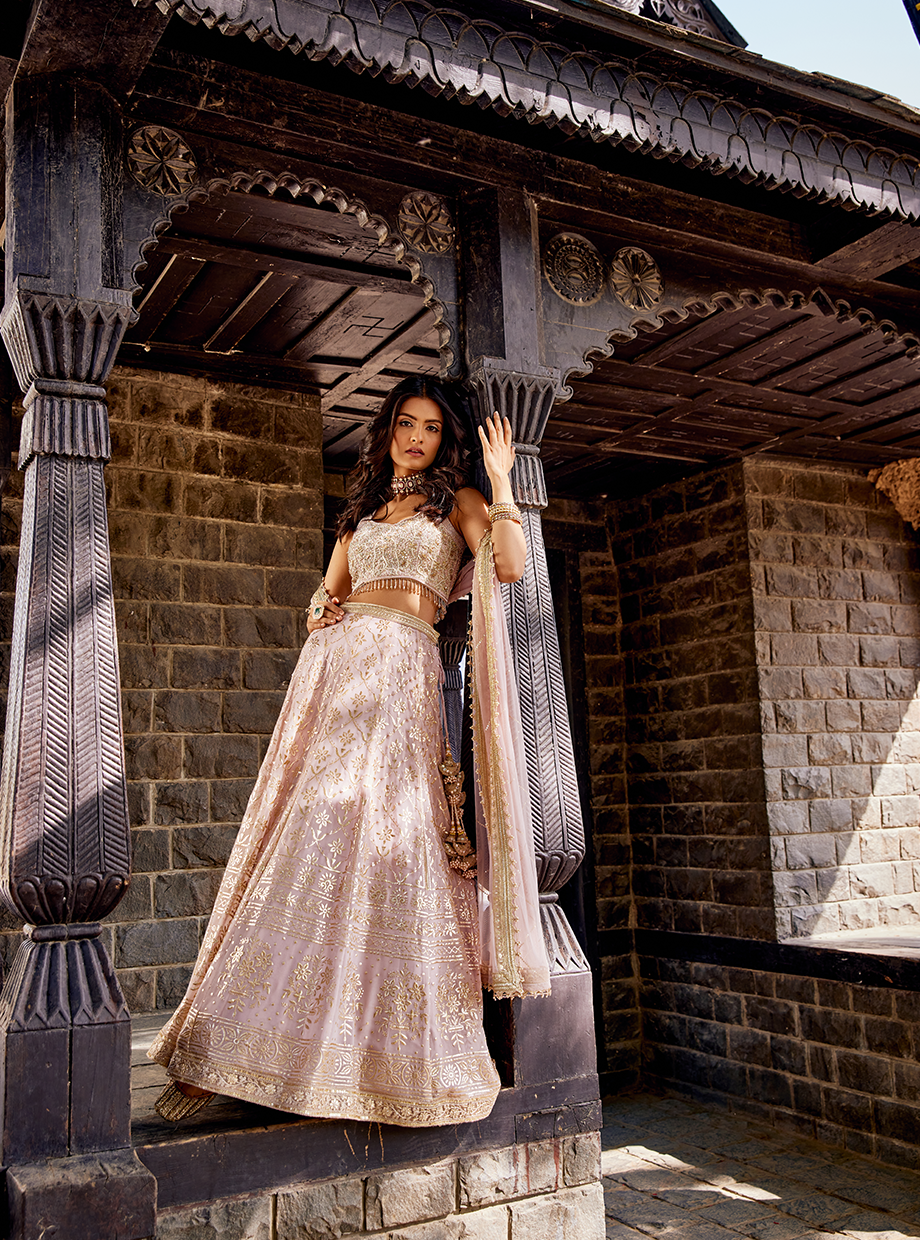Coral And Grey Banarasi Lehenga With Gharchola Dupatta